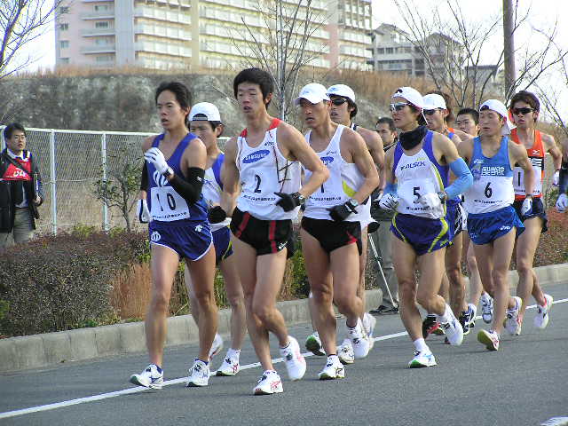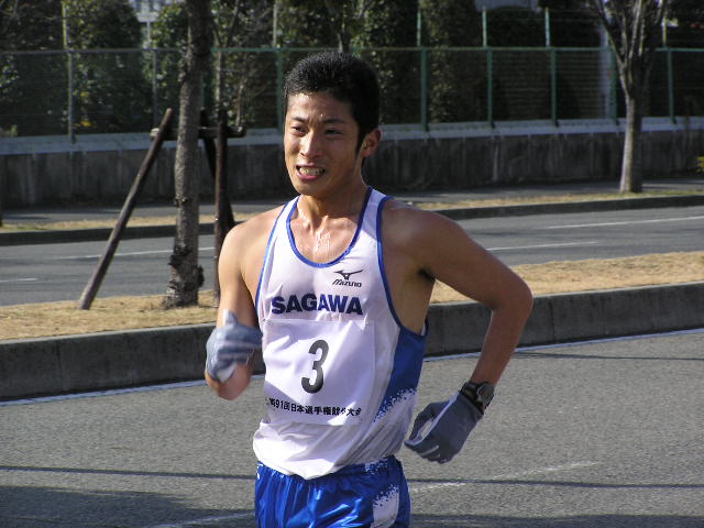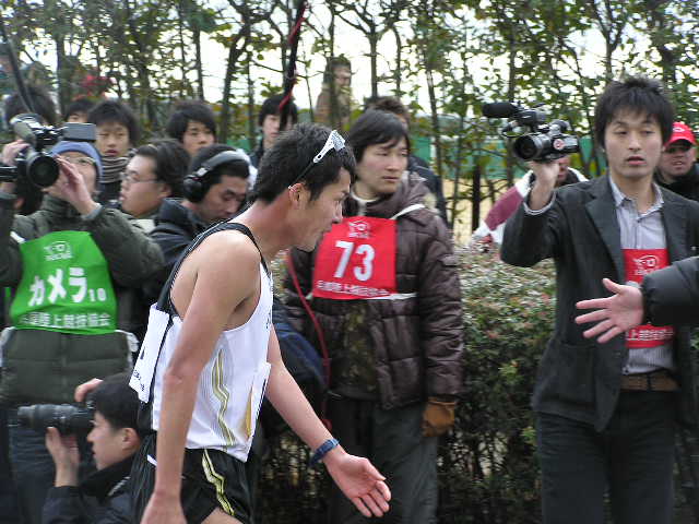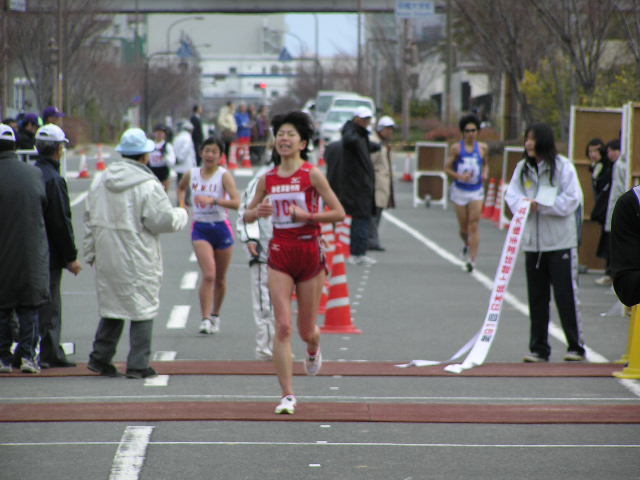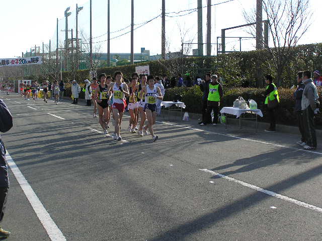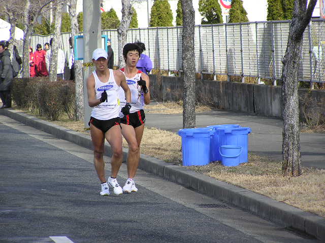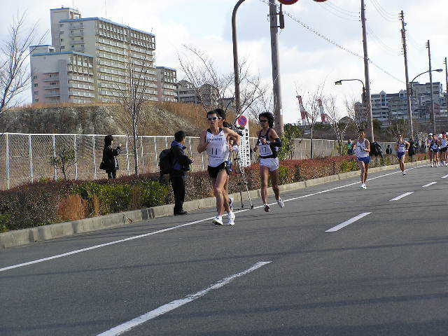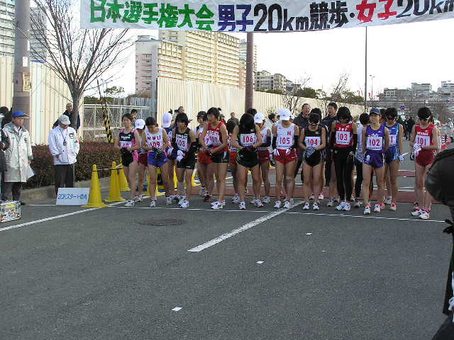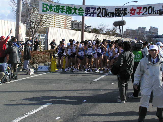 女子5km 岡田久美子(熊谷女高)23.08 男子3km 大内郡(成田高)12.51 女子3km 中友香(星翔高)14.03 (写真は男子10kmの先頭集団) 【男子20km】 参加選手は把握できていませんが、55人ほどでしょうか。 韓国から4名の選手もオープン参加となりますが オリンピックへ向けた強化の一環として出場しています。 故障中の谷井選手は彼らに着いていけず。 明石、杉本、谷内の世界陸上代表となった3選手もいます。 3連覇を狙う森岡選手。 山崎選手も譲りません。 しかし、後方との差はほとんど変化がなく 逆に第2集団の活気を与えます。 2選手とも昨年の世界陸上代表選手です。 韓国チームは海外のコーチを招聘したのでしょうか。 欧米人のコーチが指示を出していました。 このペースアップで集団はばらけました。 そのまま金選手が前へ出ると、森岡選手が遅れました。 第2集団からも遅れ、精細を欠きました。 スターとからびっこを引いたような きつそうな歩きでした。 全体的に男女ともに甘めのジャッジという印象でしたが その中で谷井選手は2つマークがつきました。 日韓バトルが開始。 写真では晴天ですが、この直前には雪が降ってきたり 曇ったりと一定しない天候で選手も苦しんでいました。 遅れてからは体が重そうな感じでした。 さらに後方には順大の後輩鈴木選手が見る見る迫ってきました。 また、すぐ後ろにも谷内選手、岡村選手、明石選手が 迫ってきて森岡ピンチに陥りました。 表情的には金選手に余裕があり、 山崎選手は疲れてきたときによくある 首が振れつつある動きに少しずつ変化してきました。 踵の高い、動きで警告をとられていました。 このあとゴール後に失格となりました。 一昨年のアジア大会でも日本は金選手に競り負けました。 この金と朴の2選手が今大会参加記録のなかで 唯一、1時間20分台のタイム所持者、 フロックではなかったことを証明。 朴選手はゴール後失格となりましたが 金選手は安定した動きで今後の期待が持てそうです。 2着でフィニッシュした山崎選手。 日本選手権では海外選手はオープン参加扱いとなり 順位は付かないため、山崎選手が日本選手権20km 6年ぶり2回目の優勝となりました(1時間21分40秒) 敗れているのに周りからは優勝おめでとうや 記者会見でも「うれしいですか?」などの質問を受け 悔しいにもかかわらず優勝会見をやらないといけないという これはきついでしょうね。さえない表情でほとんど笑顔はありませんでした。 一昨年の輪島(50km)、昨年の神戸(50km)でも日本選手権は優勝だが レースでは中国の選手に大差で敗れ、ぜんぜんすっきりとしない優勝。 今回もまたそのケースで、彼自身ちょっとかわいそうな気がしました。 ちなみにゴール直前には記者とテレビ部隊と場所取りを巡って 険悪な雰囲気もあったゴール地点。 それだけ慣れない報道陣も多くいて、今まで以上に関心が高かったようです。 レースの方は中盤のけん制しあったせいもあって、優勝タイムは1時間21分台。 途中雪も降ってくるコンディションでしたがそれでも1時間20分台を期待したかったところです。 2000年の大会では柳沢選手が1時間19分29秒の日本記録をマークしています。 そのときはずっと雨が降るコンディションの中、後半のペースアップで大バトルがありました。 それに比べるとちょっと物足りない、このまま男子20kmの日本記録は不滅の日本記録になる 恐れも出てきました。 そんな中ですが、オリンピックA標準(1時間23分)を4選手(山崎、森岡、鈴木、谷内)が突破しました。 また、1時間30分を19名の選手が破っているという全体的にはレベルの高いレース。 逆に審判の方はやや甘めな感じでした。 【女子20km】 昨年から4名がオリンピックA標準(1時間33分30秒)を突破。 今日のレースで絞られて来る形となります。 女子にも韓国の選手が1名出場しましたが、 タイム的には日本でレースを経験するというレベルの選手でしたので 日本選手が主導権を握ります。 スタート直後から、日本記録保持者の川崎選手が飛び出します。 スタートから一気に行くのは作戦だったようで このあとどんどん後方と差を広げていきます。 川崎選手の先制攻撃に、やや不意を突かれた感じがしました。 小西選手は昨年、A標準を突破しながら 世界陸上代表になれなかった選手。 川崎選手は先へ行ってしまいましたが 2番手の渕瀬選手を視界に捕らえながら追って行きます。 坂倉、小西の2選手が迫ります。 関東インカレ3連覇の大利選手。 彼女もA標準を突破するスピードで進んでいました。 後半に入って、寒さも影響してか徐々に日本記録を 下回るペースになってきました。 1時間29分台の好タイムで優勝。 北京当確第1号と言っていいでしょう。 前半から飛び出し、一度もトップを譲ることはありませんでした。 このあと小西選手、渕瀬選手と続き、大利選手が坂倉選手を逆転しました。 この結果、新たに大利選手を加え5人がA標準を突破することになり、 川崎選手に続く代表の座を巡り、3月の能美大会